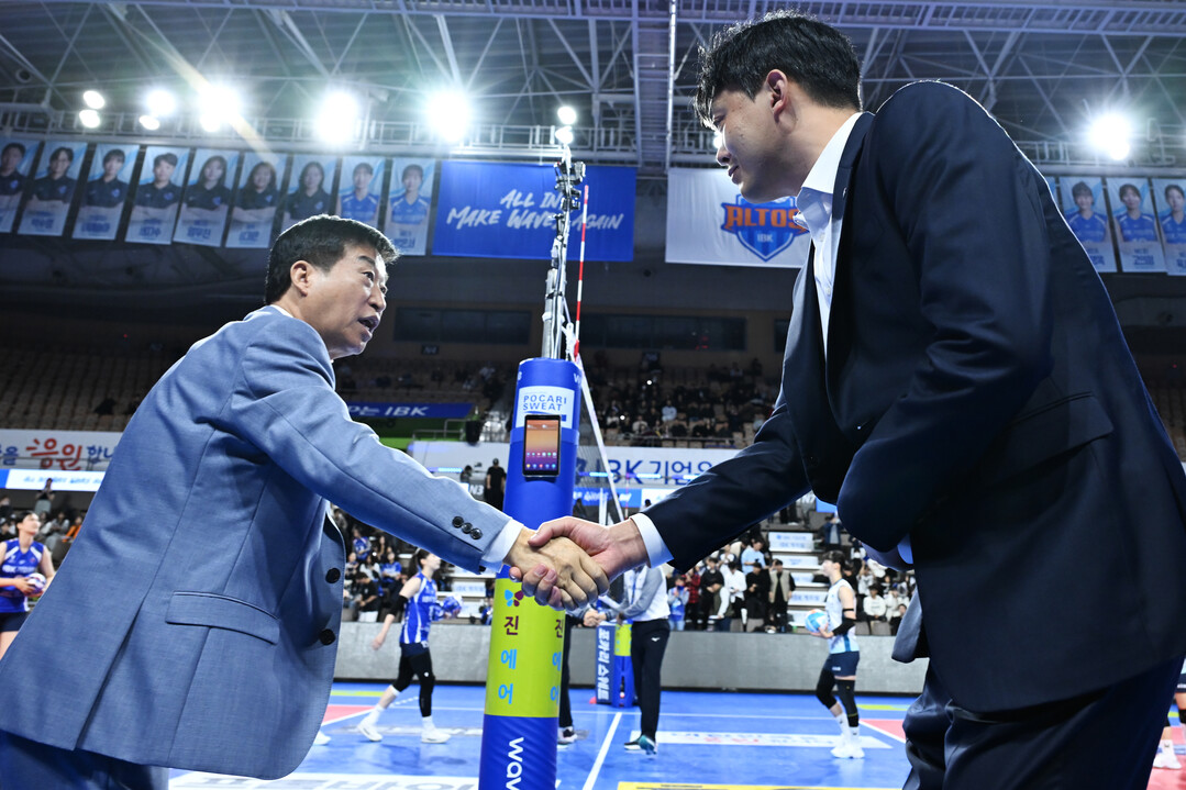 경기 전 악수를 나누는 IBK기업은행 김호철(왼쪽) 감독과 GS칼텍스 이영택 감독.
