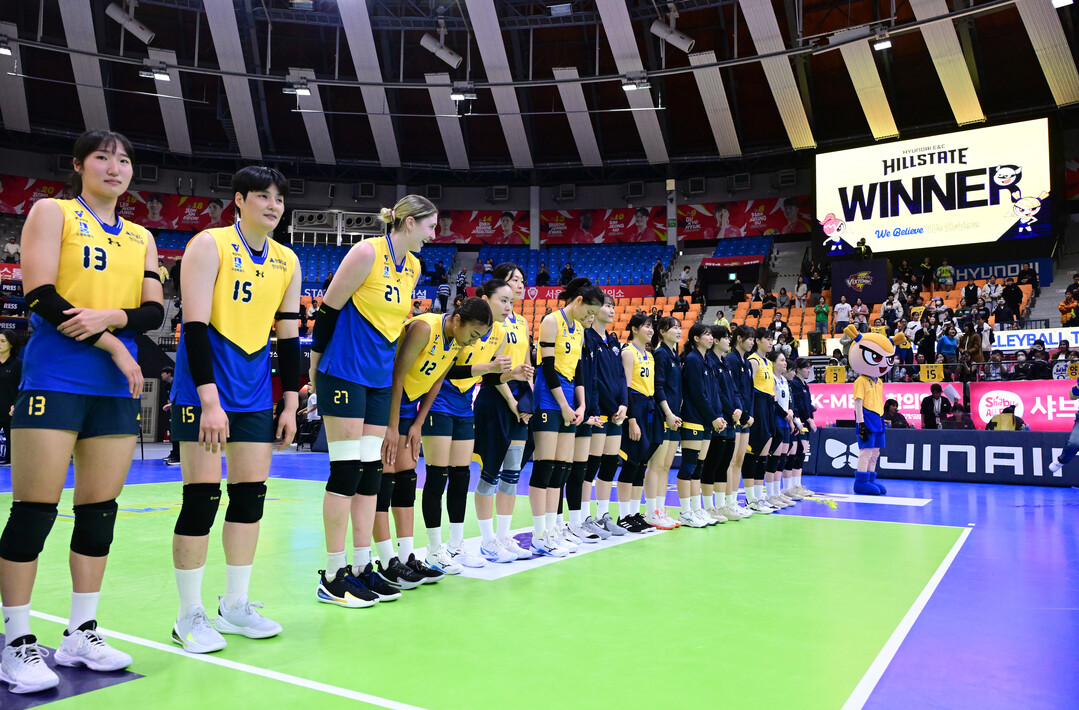 [더발리볼 = 유진형 기자] 현대건설이 4일 오후 경기도 수원실내체육관에서 열린 '진에어 2025~2026 V-리그' IBK기업은행과의 경기에서 승리한 뒤 팬들에게 인사하고 있다.
