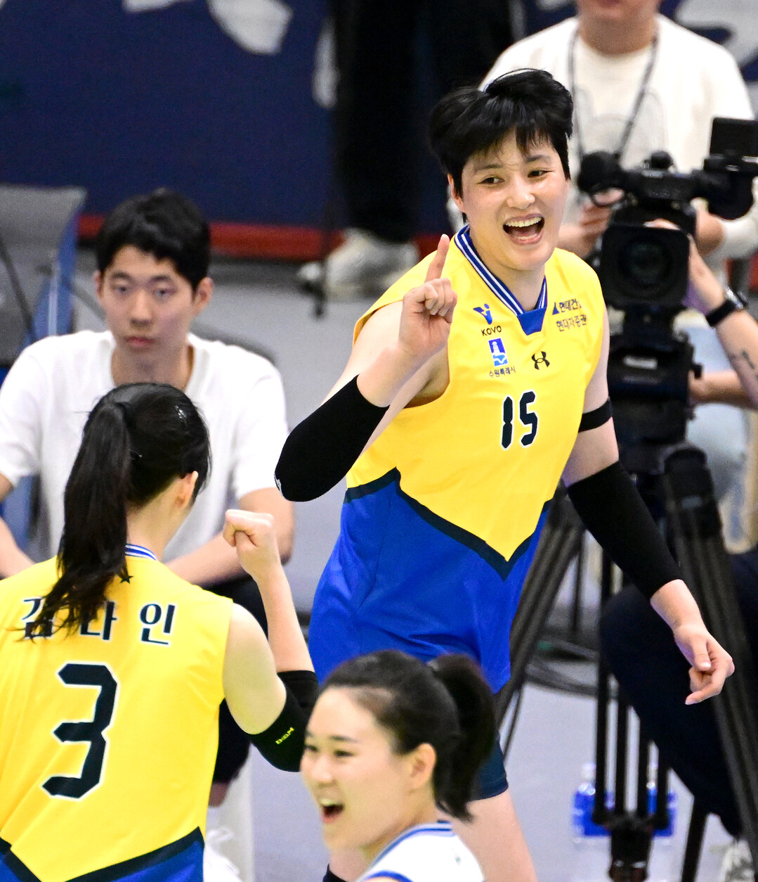 [더발리볼 = 유진형 기자] 현대건설 김희진이 4일 오후 경기도 수원실내체육관에서 열린 '진에어 2025~2026 V-리그' IBK기업은행과의 경기에서 기뻐하고 있다.