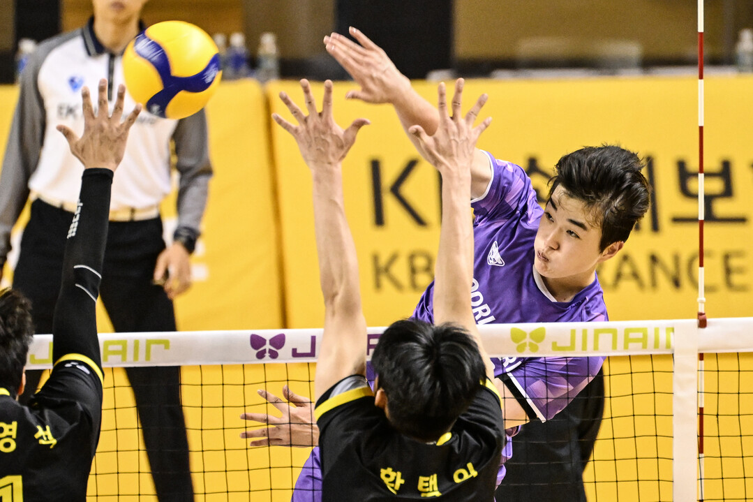 [더발리볼 = 한혁승 기자] 4일 경기도 의정부 경민대학교 기념관에서 열린 진에어 2025~2026 V-리그 남자부 KB손해보험-우리카드 경기.