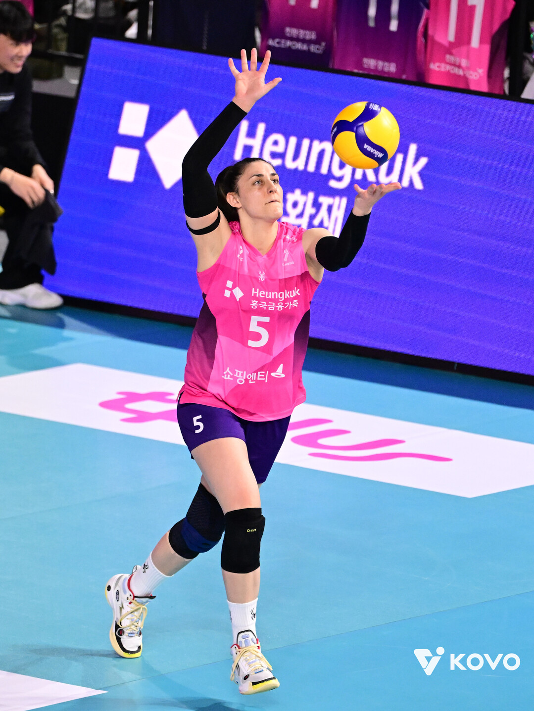 IBK기업은행과 현대건설에 연달아 패한 흥국생명. 정관장전에서는 피치가 해결사로 나섰다. 이날 피치는 13.68%의 공격 비중을 가져갔고, 공격 효율은 61.54%로 높았다. 범실도 1개에 그쳤다.