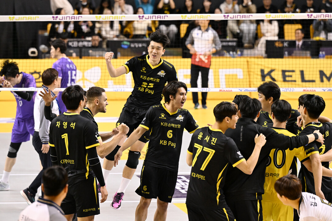 KB손해보험 선수들이 세트스코어 3-1로 우리카드에 승리 후 기뻐하고 있다.