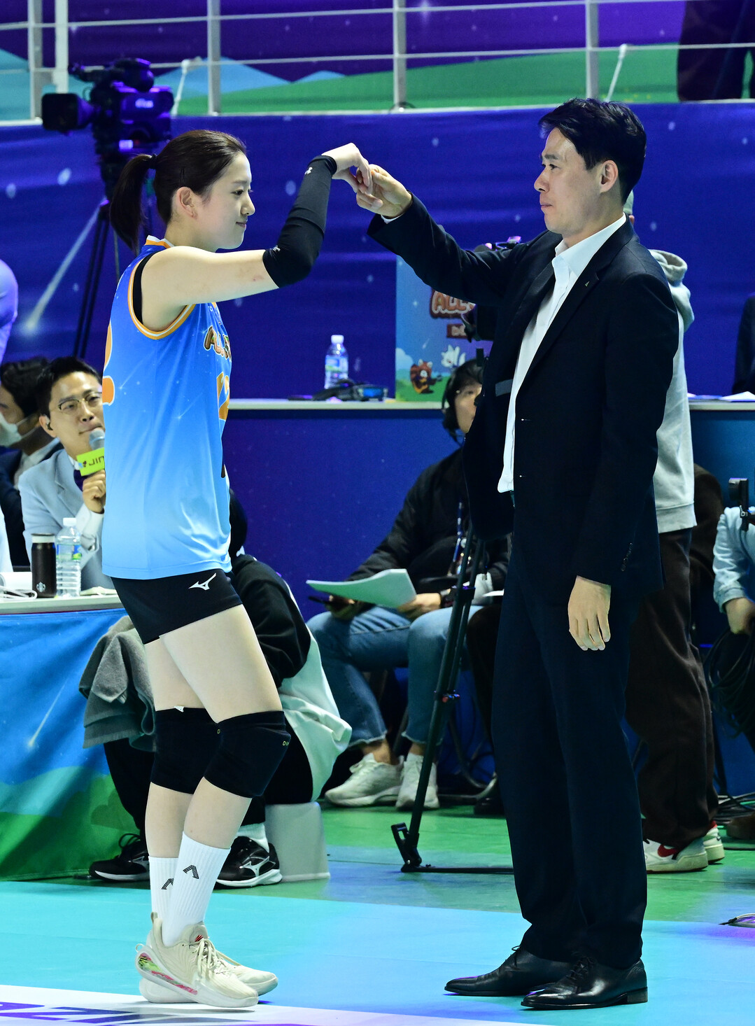 [더발리볼 = 춘천 곽경훈 기자] 흥국생명 이다현과 현대건설 강성형 감독이 25일 오후 강원도 춘천 호반체육관에서 진행된 ‘진에어 2025~2026 V리그’ 올스타전에서 퍼포먼스를 선보이고 있다.