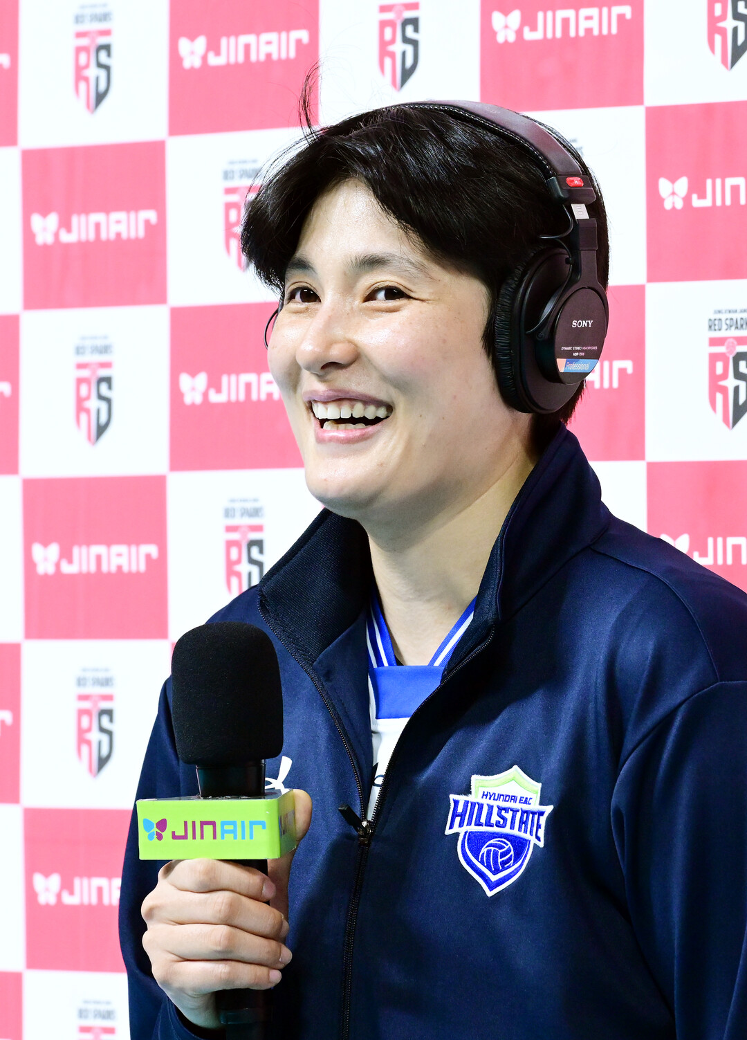 [더발리볼 = 곽경훈 기자] 현대건설 김희진이 25일 대전충무체육관에서 진행된 '진에어 2025~2026 V-리그' 여자부 2라운드 정관장과의 경기에서 승리한 뒤 방송사 인터뷰를 하고 있다. [사진= 한국배구연맹 KOVO]