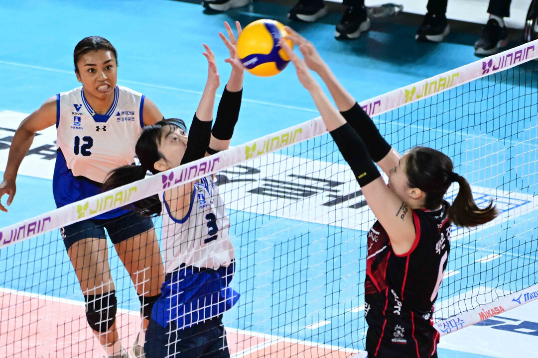 [더발리볼 = 곽경훈 기자] 현대건설 김다인과 정관장 박은진이 25일 대전충무체육관에서 진행된 '진에어 2025~2026 V-리그' 여자부 2라운드 정관장과의 경기에서 네트 앞에서 공격과 수비를 하고 있다. [사진= 한국배구연맹 KOVO]