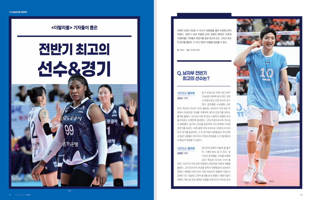 [더발리볼 = 이석희 기자] 진에어 2025~2026 V-리그가 반환점을 돌아 4라운드까지 마쳤다. 전반기 내내 치열한 순위 경쟁이 펼쳐진 가운데 <더발리볼> 기자들이 전반기를 빛낸 최고의 선수, 그리고 최고의 경기를 뽑았다. V-리그 전반기 흐름을 짚어볼 수 있다.
