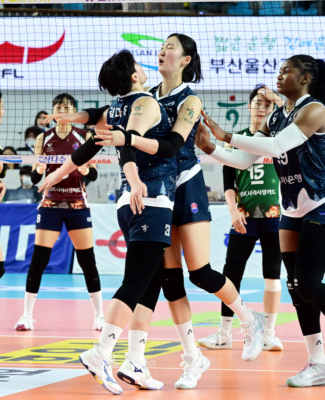 [더발리볼 = 곽경훈 기자] 한국도로공사 김세빈이 14일 경북 김천실내체육관에서 열린 프로배구 '진에어 2025~2026 V리그' IBK기업은행과의 경기에서 득점을 올린 뒤 김다은과 기뻐하고 있다.