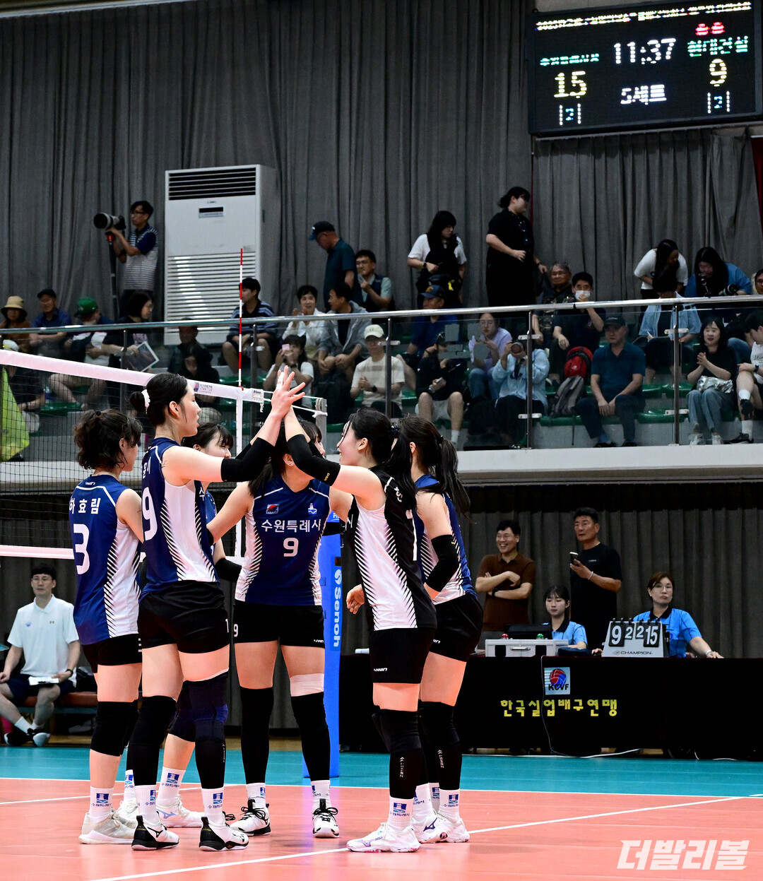 수원특례시청이 세트스코어 3-2로 승리한 뒤 기뻐하고 있다.