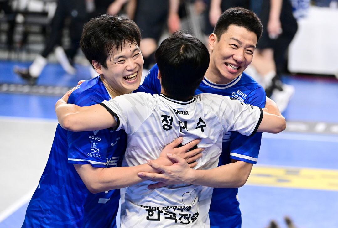 [더발리볼 = 유진형 기자] 한국전력이 26일 오후 충청남도 천인시 유관순체육관에서 열린 '진에어 2025~2026 V-리그' 현대캐피탈과의 경기에서 승리한 뒤 기뻐하고 있다.