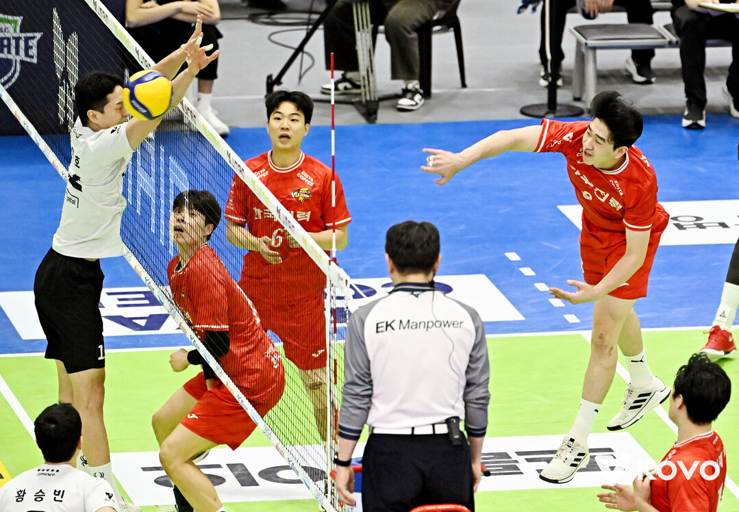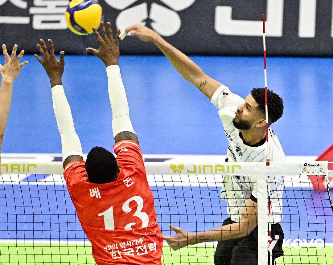 지속적으로 따라붙은 한국전력은 신호진의 공격을 블로킹으로 막아낸 뒤 베논의 오픈 공격이 득점으로 이어지며 20-19 역전에 성공했다. 23-22에서는 베논이 서브 득점을 터트렸고 박승수의 터치 아웃으로 한국전력이 1세트를 가져갔다.
