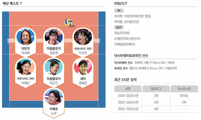지난 시즌 정관장의 강점은 메가와 부키리치의 쌍포가 보여주는 막강한 공격력이었다. 여기에 국가대표 표승주와 국내 최강 미들블로커 듀오 정호영, 박은진까지 지원 사격해 상대팀으로서는 답답할 노릇이었다. 그러나 새 시즌에는 메가, 부키리치, 표승주가 모두 없다. 또한 위파위가 십자인대 파열 수술 후 재활로 인해 시즌 초반 출전이 힘들다. 자네테 혼자로는 힘들다. 중앙에서 존재감을 보여주는 정호영, 박은진 외 박혜민, 이선우, 전다빈, 곽선옥 등이 힘을 내야 한다. 고희진 감독은 국내 선수들의 기량이 많이 올라왔다고 자신한다. 하지만 훈련과 실제 경기는 다르다. 실전에서 부담감을 이겨내고 존재감을 뽐내야 정관장이 꿈꾸는 우승도 바라볼 수 있다.