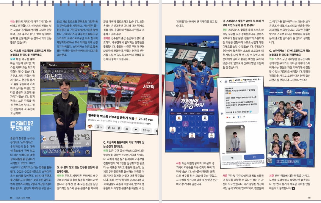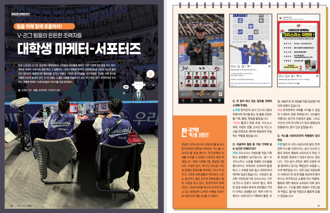 한국전력은 대학생 서포터즈 ‘빅스톰 서포터즈’를 운영 중이다. 서포터즈 운영으로 구단 사회관계망서비스(SNS) 채널을 활성화하고, 신규 아이디어 유입 및 콘텐츠 구성 다변화를 시도하는 것이 주요 목적이다. 현재는 사진부 2명과 동영상부 3명으로 구성돼 활동 중이다. 배구단 SNS용 사진 및 동영상 콘텐츠를 제작한다. Z세대 대학생들의 머리에서 나오는 참신하고 젊은 감각의 콘텐츠들이 많은 사랑을 받고 있다. 한국전력과 함께 2025-2026시즌을 에너지 넘치게 보내고 있는 동영상부 노우영-서해슬 서포터와 직접 이야기를 나눴다.